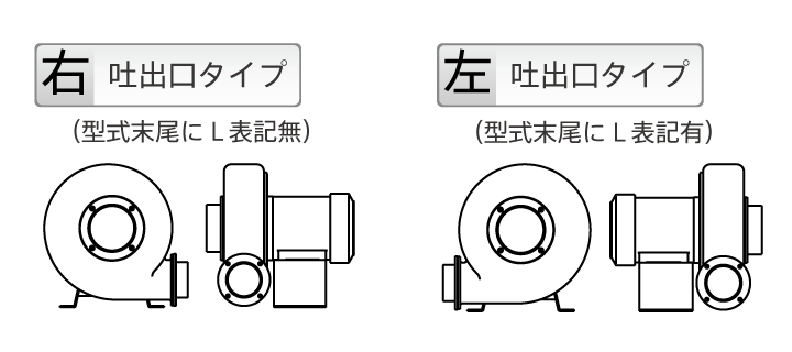 羽根車の回転方向により吐出口方向を左右でお選びいただけます。